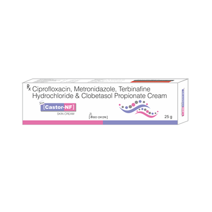 DESCRIPTION: | Castor-NF cream contains Ciprofloxacin, to relive bacterial infections; Metronidazole, to relive bacterial & protozoal infections; Terbinafine, to relieve fungal infections & Clobetasol, a corticosteroid that relives itching, irritation, redness & swelling. It is first line of drug in all kind of skin infection such as of eczema, dermatitis, fungal infections, bacterial infections & mixed infection of skin. |