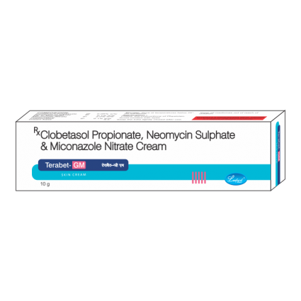 | DESCRIPTION: | Terabet-GM cream contains Clobetasol, a steroid to relieve itching, redness & swelling; Neomycin, an antibiotic to cure bacterial infections & Miconazole, an antifungal to cure fungal infections. It is prescribed in cases of resistant skin infections where secondary bacterial infection and/or fungal infection are present, suspected or likely to occur. |