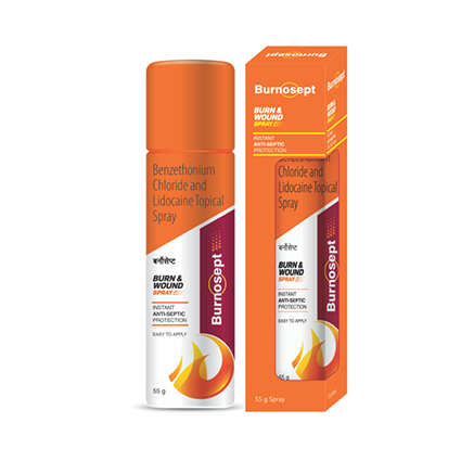 DOSAGE/DIRECTIONS FOR USE: | Clean the affected area thoroughly, shake Burnosept Spray can well before using. Hold the can upright at a distance of 10 to 15 cms spray at the surface until it is wet. If require can use bandage to cover the affected area, only after the spray dries. It can be used 3 to 4 times a day. It should not be used in children less than 2 years of age. |