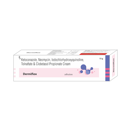 | DESCRIPTION: | Dermiflox cream contains Clobetasol, a corticosteroid that relieves itching, redness and swelling; Gentamicin, an antibiotic that relieves bacterial infections; Iodochlorhydroxyquinoline, an antibiotic & antiprotozoal to relieve bacterial & protozoal infections along with Tolnaftate & Clotrimazole, two antifungal drugs to relieve fungal infection. It is prescribed in cases of resistant and secondary infections of skin caused by various different kind of disease causing germs. |