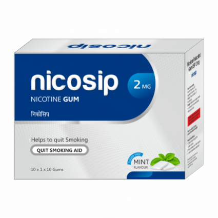 DESCRIPTION: Nicosip 2 mg chewing gum contains Nicotine 2 mg which is indicated in quitting Cigarette Smoking & Tobacco Chewing. Nicosip acts in the body by reducing Nicotine craving that ultimately withdraws the craving of cigarette smoking and/or tobacco chewing.