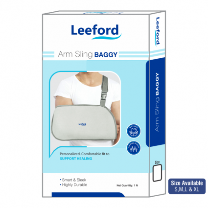 DESCRIPTION: | Leeford Arm Sling Baggy provides perfect immobilization and support to fractured arm. It is designed for maximum support and coverage, can accommodate bulky casts and thumb cradle reduces thumb fatigue. Its Shoulder pad and high cushioning further enhance user comfort and adjustable sling helps in optimal positioning of arm. SIZES AVAILABLE: S,M,L & XL |