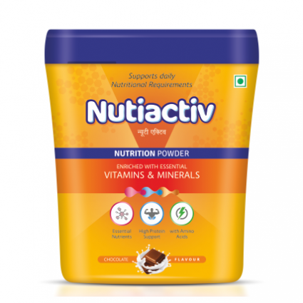 DESCRIPTION: | Nutiactiv Protein powder is a tasty chocolate adult nutritional drink which provides high protein with B Vitamins and Minerals like Calcium, Iron, Potassium that supports growth and maintenance of muscle mass, strengthen bones, improves metabolism, provides energy and boosts immunity. It consists important vital nutrients which helps to improve overall health of an individual. |