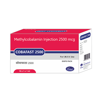 DESCRIPTION: | Cobafast 1500/2500 contains Methylcobalamin (bioactive form of Vitamin B12). Methylcobalamin is important for the brain and nerves, and for the production of red blood cells. It is indicated in Vitamin B12 deficiency, Pernicious anaemia, diabetic neuropathy, peripheral neuropathy, cardiovascular disorders, hyperhomocysteinemia, Alzheimer disease and degenerative disorders. |