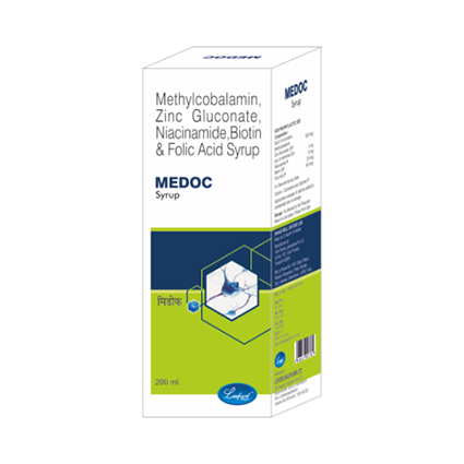 DESCRIPTION: | Medoc syrup contains Methylcobalamin (Vitamin B12), Zinc with other B vitamins. Medoc Syrup is useful in the management of Diabetic neuropathy, Vitamin B12 deficiency, Peripheral neuropathy and decreases serum homocysteine levels. |