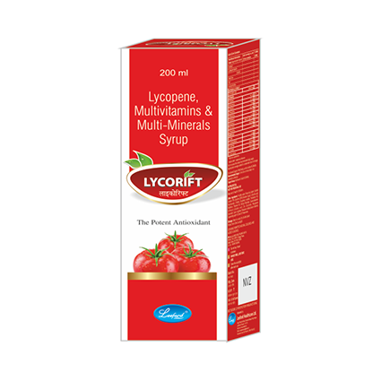 Lycorift Syrup contain Lycopene (Antioxidant) in combination with vitamins and minerals for good health and well-being. Lycopene is the most potent antioxidant known acts as an internal bodyguard protecting human cells from free radical damage. Lycorift Syrup is indicated in general weakness, decreased immunity, Pre-eclampsia (high blood pressure in pregnancy), IUGR (low growth of baby in pregnancy), Premature ageing, cardiovascular diseases and male infertility and Gingivitis. |