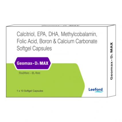 Geomax-D3 Max softgels contains Calcium, Calcitriol (a bioactive form of Vitamin D3), EPA, DHA, Methylcobalamin (form of Vitamin B12), Folic acid and Boron. This is a fortified combination for your bone health. Geomax D3 Softgels are indicated in Osteoporosis, hypocalcemia and in pregnancy and Lactation. |