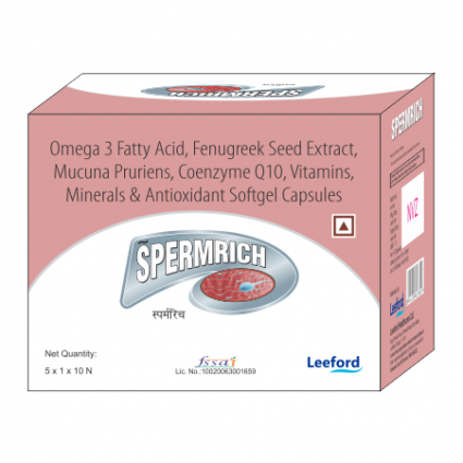 Spermrich contains Coenzyme Q10, Lycopene, EPA & DHA along with B vitamins to regulate spermatogenesis and to correct sperm formation. Spermrich softgels increase sperm count, corrects sperm morphology and physiology in males suffering from infertility especially in cases of low sperm count and in reduced sperm motility. |