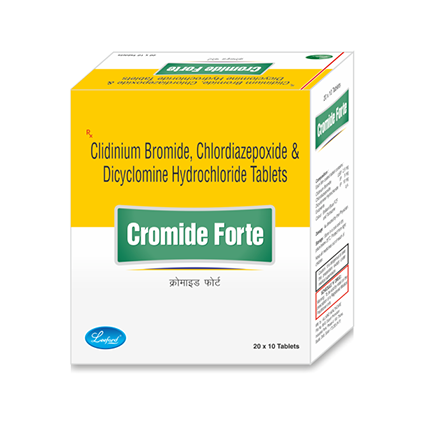 Cromide Forte contains Clidinium, Chlordiazepoxide & Dicyclomine, an antispasmodic drug that reduces the spasm in GI tract. Cromide Forte is used in pain associated with spasm as in cases of irritable bowel syndrome (IBS).It is also used in psychosomatic disorders. |