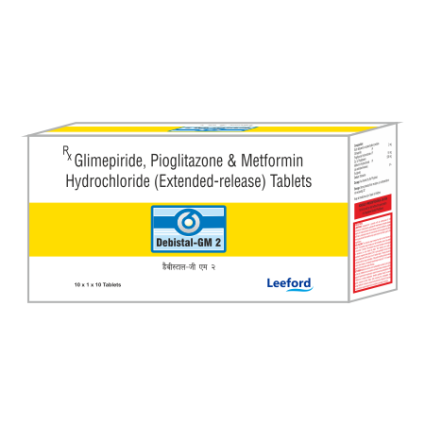 DESCRIPTION: | Debistal-GM 2 tablet contains three drugs Glimepiride 2 mg, Pioglitazone 15 mg & Metformin Hydrochloride as sustain release form 500 mg. This triple drug combination is prescribed for diabetes & acts by three different mechanisms in patient to control hard to treat diabetes. |