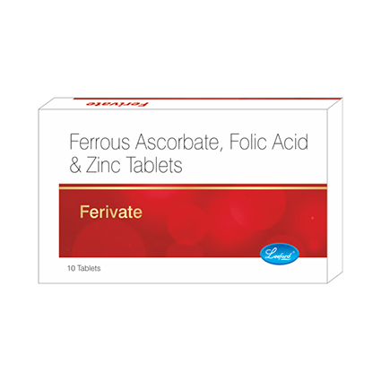 DESCRIPTION: | Ferivate tablet contains Ferrous Ascorbate a highly absorbable form of iron with folic acid and Zinc. Ferivate tablet is indicated for preventing and treating iron deficiency anaemia, pregnancy and lactation, post-surgery and in haemodialysis. |