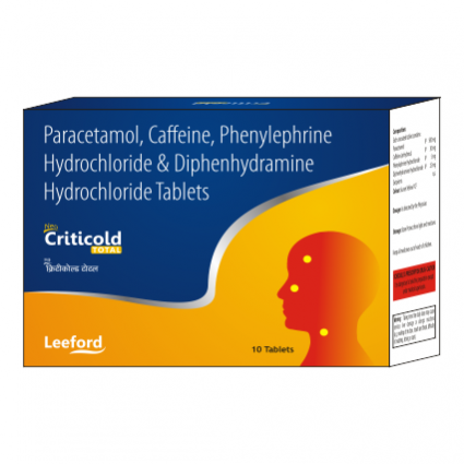 Criticold tablet is a combination of medicines which contains Paracetamol an analgesic and antipyretic, Caffeine a CNS stimulant, Phenylephrine a decongestant and Diphenhydramine a anti-allergic. It is used for the relief of cold and flu including headache, fever, nasal and sinus congestion, runny or stuffy nose. |