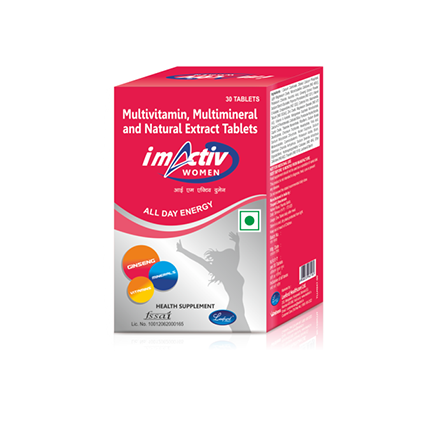 DESCRIPTION: IM Activ Women tablet contains all vitamins, minerals along with Lycopene & Ginseng to offer a complete solution in today’s fast paced life. IM Activ Women Enhances physical performance, supports cognitive function, helps in proper metabolism, helps regulate & maintain Immune function, provides antioxidant and nutritional support & supports active and hectic life style of modern era.