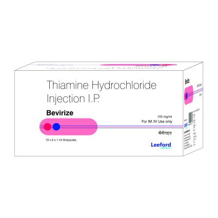 Bevirize injection contains Thiamine Hydrochloride, a water soluble form of Vitamin B1 for IM or IV (Infusion or slow direct injection) use. Thiamine Hydrochloride injection is used in all the patients of dialysis to prevent its loss and thus complications in metabolism which is an essential pathophysiology of the body in CKD. Bevirize is also indicated when giving IV dextrose to individuals with marginal thiamine status to avoid precipitation of heart failure.