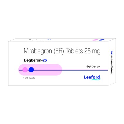 Begberon-25 contains Mirabegron which is used to treat overactive bladder (a condition in which the bladder muscles contract uncontrollably and cause frequent urination, urgent need to urinate, and inability to control urination) in adults. It is also used to treat neurogenic detrusor overactivity (a bladder control condition caused by brain, spinal cord or nerve problem) in children 3 years of age and older. Mirabegron is in a class of medications called beta-3 adrenergic agonists. It works by relaxing the bladder muscles to prevent urgent, frequent, or uncontrolled urination.