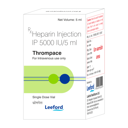 Thrompace 5000 is used as an anticoagulant. It contains Heparin Sodium which is an anticoagulant and used to prevent blood clotting in Haemodialysis and in deep vein thrombosis. Heparin is widely used for thromboprophylaxis or treatment in many clinical situations, including cardiovascular and orthopaedic surgery and invasive procedures, acute coronary syndromes, atrial fibrillation, peripheral occlusive disease, dialysis, and during extracorporeal circulation.